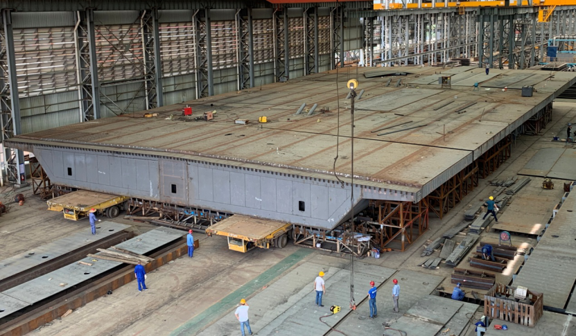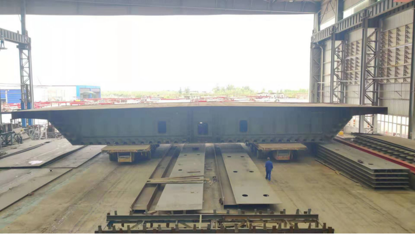 上午11時(shí),隨著現(xiàn)場(chǎng)總指揮一聲令下,重達(dá)240余噸的首個(gè)鋼箱梁節(jié)段由兩臺(tái)150噸自行式液壓平板車緩緩抬起,平穩(wěn)脫離總拼胎架并駛出廠房,標(biāo)志著首輪6個(gè)節(jié)段拼裝完成并正式下胎,轉(zhuǎn)入室外臨時(shí)存放區(qū)。
