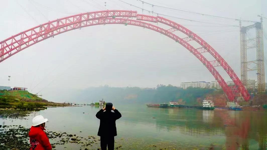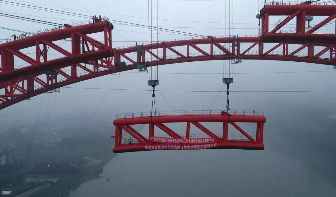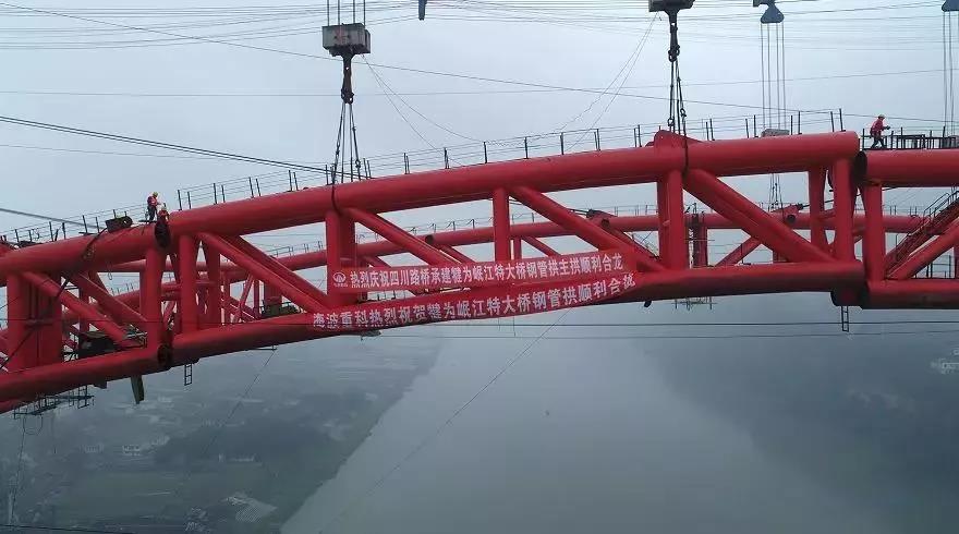 (海波重科新聞報道)2020年1月15日,犍為岷江特大橋施工現(xiàn)場,只見高高的吊塔聳立岷江兩岸,纜索吊裝系統(tǒng)已準備就緒;江面上,運輸船舶搭載著最后一段拱肋,將其運送到指定位置?!伴_始吊裝!”伴隨著現(xiàn)場一聲指令,拱肋從江面緩緩升起。經(jīng)過1個多小時的吊裝,上午10時42分,由海波重科承接的犍為岷江特大橋主橋457.6m鋼管拱橋,完成最后一段拱肋吊裝,實現(xiàn)了拱圈高精度合龍,合龍精度3mm,合攏應(yīng)力和全橋線形均滿足設(shè)計規(guī)范要求。