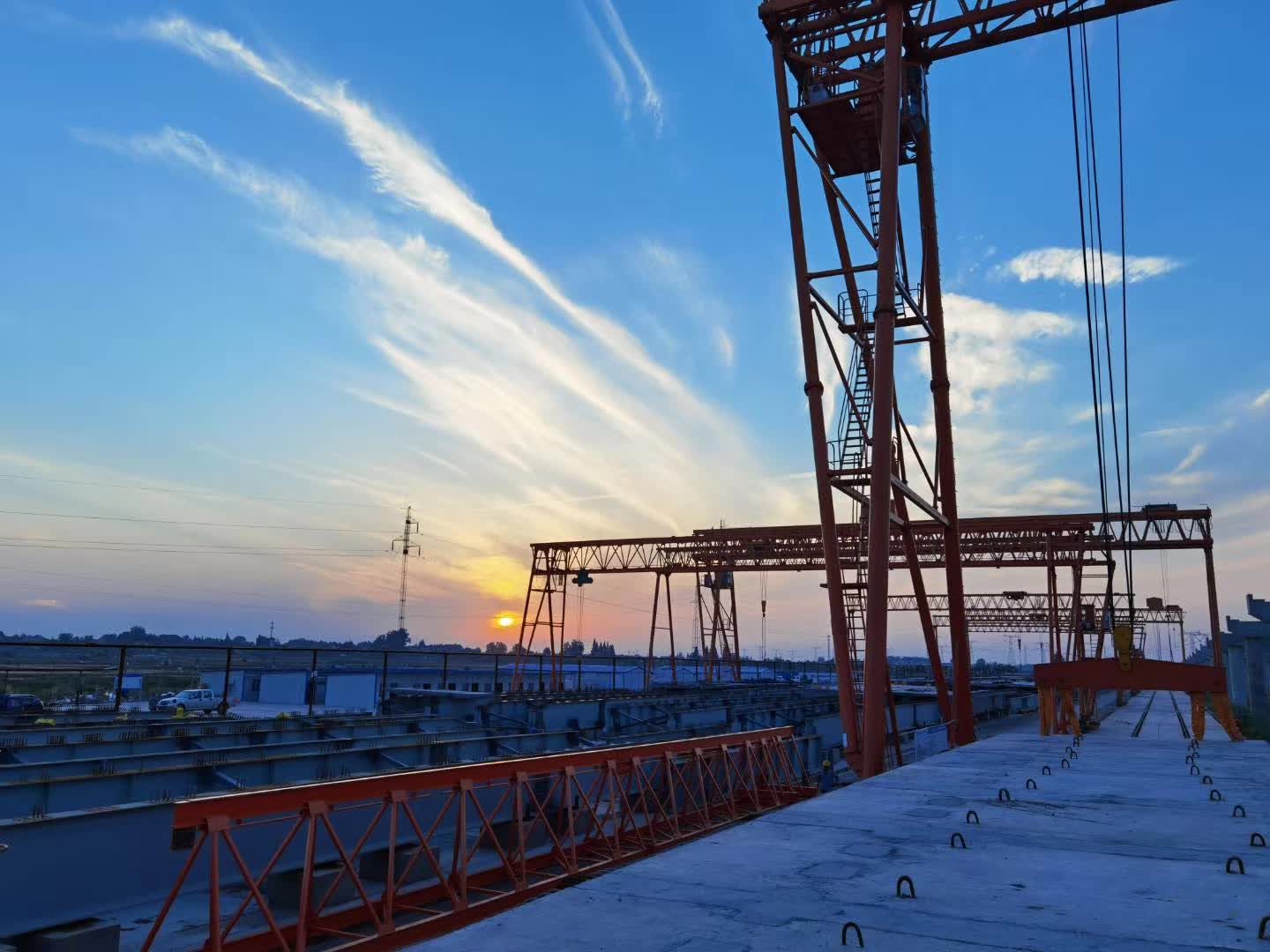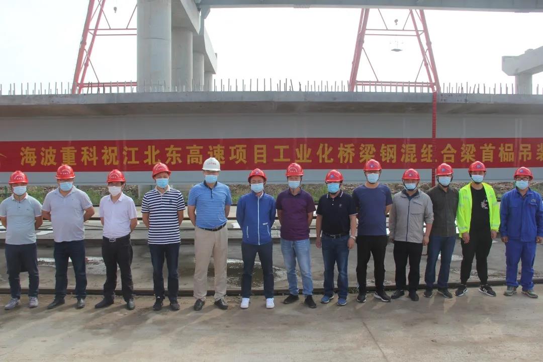 (海波重科新聞報(bào)道)2020年5月26日上午9:00,業(yè)主、項(xiàng)目公司副總經(jīng)理黃遵義、長(zhǎng)江路橋江北東高速項(xiàng)目經(jīng)理王懷才、副經(jīng)理白朝峰、總工楊建波、PC預(yù)制場(chǎng)項(xiàng)目負(fù)責(zé)人及項(xiàng)目副經(jīng)理程波、技術(shù)部部長(zhǎng)歐陽(yáng)旭、監(jiān)理單位總監(jiān)辦總監(jiān)文輝、副總監(jiān)張貴士、副總監(jiān)趙廷奎、質(zhì)量部部長(zhǎng)鄧再鑫、試驗(yàn)室主任安紅偉、海波重科總經(jīng)理劉乾俊、海波重科項(xiàng)目現(xiàn)場(chǎng)負(fù)責(zé)人閆思為等各位領(lǐng)導(dǎo)、現(xiàn)場(chǎng)作業(yè)人員及媒體記者工作人員共同見(jiàn)證江北東高速項(xiàng)目工業(yè)化橋梁鋼混組合梁首吊的成功。