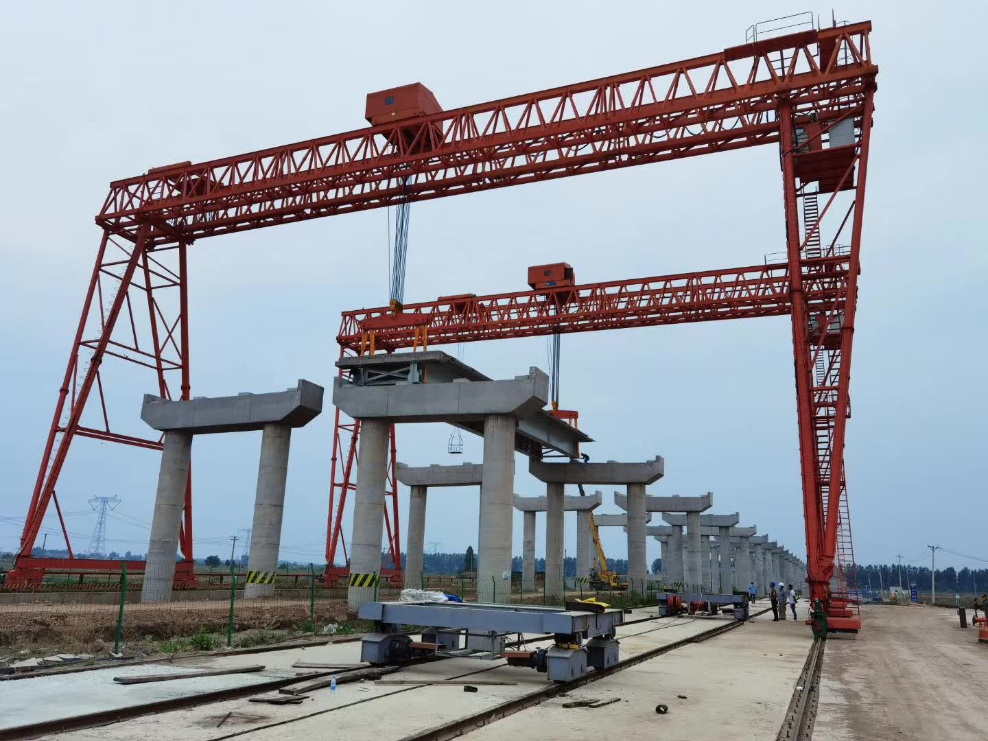江北東高速公路是湖北省“十三五”綜合交通規(guī)劃重點(diǎn)建設(shè)項(xiàng)目之一,本次吊裝的鋼混組合梁是工業(yè)化橋梁上部結(jié)構(gòu)第一榀梁,位于汊河服務(wù)區(qū)特大橋右幅27孔,單榀梁長(zhǎng)30m、寬6.125m、高1.7m,重134.4噸,利用2臺(tái)125噸跨墩龍門(mén)吊進(jìn)行吊裝。本次吊裝的鋼混組合梁由2#疊拼梁場(chǎng)疊拼,采用“開(kāi)口鋼梁+砼橋面板” 的鋼混組合梁,先簡(jiǎn)支后橋面連續(xù)。