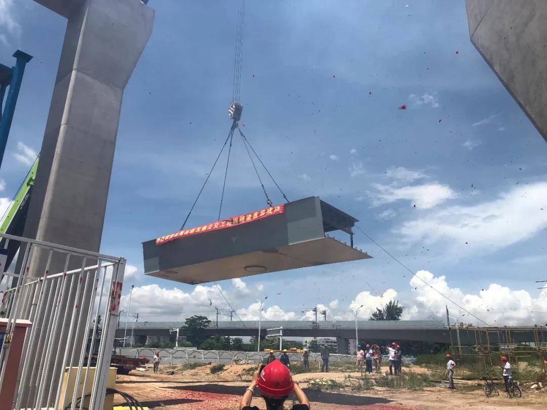 據(jù)海波重科項目負責人介紹,鋼箱梁部分節(jié)段上跨港灣大道,港灣大道為珠海市高新區(qū)主要道路,車流量巨大,箱梁節(jié)段拼裝、吊裝要求高,施工難度較大,為減小鋼箱梁吊裝對現(xiàn)有地面道路通行的影響,保障車輛正常通行,項目技術人員合理設計了梁段安裝順序,并在鋼箱梁施工時,采取半封道(單邊雙向車道)、半施工措施,做好交通導流措施,提前分流,減少交通壓力;選擇夜間車流量較少時段施工,保證雙向往返車輛通行安全。